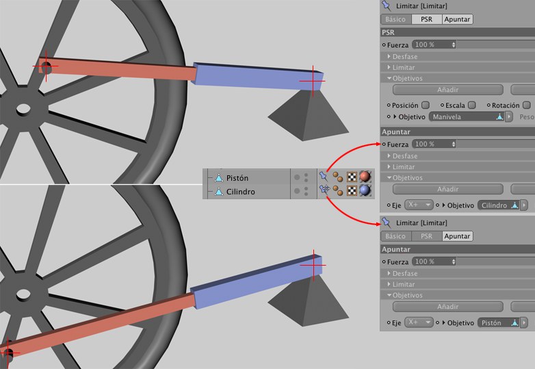 Ahora hace falta una etiqueta Limitar para el cilindro con un Limitador Apuntar en el punto de rotación del pistón (o del cigüeñal). No olvides que Limitar se aplicará en el orden en el que están en el Gestor de Objetos. Si, por ejemplo, el cilindro del ejemplo anterior se colocase por encima del pistón en el Gestor de Objetos, el resultado no sería correcto (a menos que quieras modificar la prioridad de las Expresiones directamente.