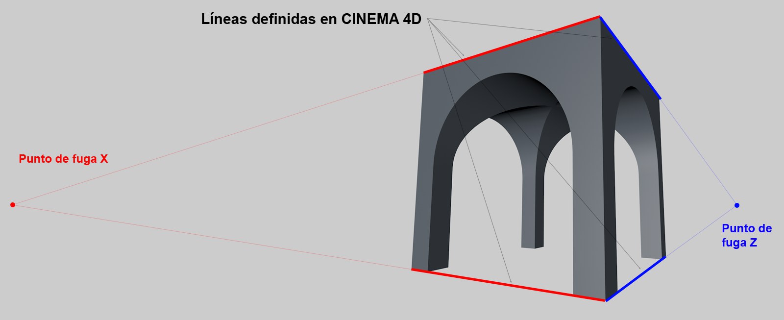 Para realizar la reconstrucción, Cinema 4D necesita 2 puntos de fuga y 2 planos apilados verticalmente. Para definir puntos de fuga, deben dibujarse líneas paralelas en la imagen (cuando se muestran en una vista en perspectiva, esas líneas crean un punto de fuga):