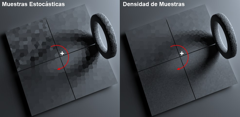 Usa esta opción para definir la densidad de grabaciones (ver la descripción del parámetro Muestras Estocásticas a nivel de objeto (global: Densidad de Grabaciones). Una densidad de muestras aumentada puede usarse para "capturar" una sombra muy sutil de la escena.