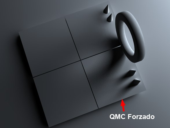 " El Muestreo QMC Forzado" activo está aplicado al cuadrado abajo a la derecha. Observa como las sombras son más precisas que en los otras 3 cuadrados.