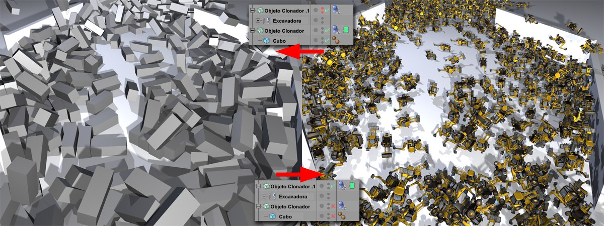 En el siguiente ejemplo, se ha bakeado una simulación utilizando cubos (izquierda) y se ha asignado la etiqueta Caché MoGraph a un objeto Clonador similar que clona un vehículo de construcción compleja.