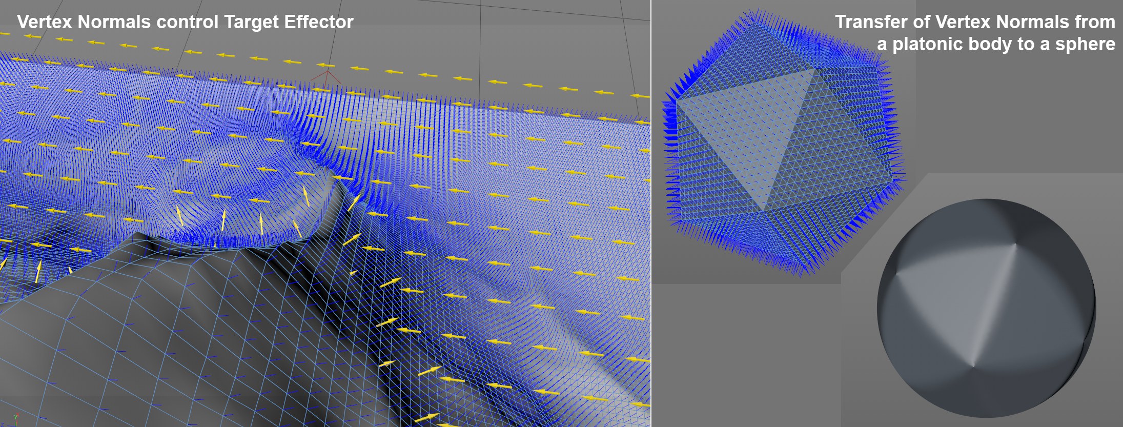 A la izquierda, la etiqueta Vertex Normal en un Efector Objetivo, a la derecha en otra etiqueta Vertex Normal (el cuerpo platónico y la esfera deben ser congruentes).