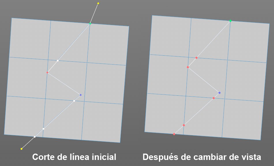 Tan pronto como se cambia de la vista en perspectiva a otra vista, los puntos de corte se convertirán en puntos de control y partes de la línea de corte que no pueden ser proyectadas se ocultarán.