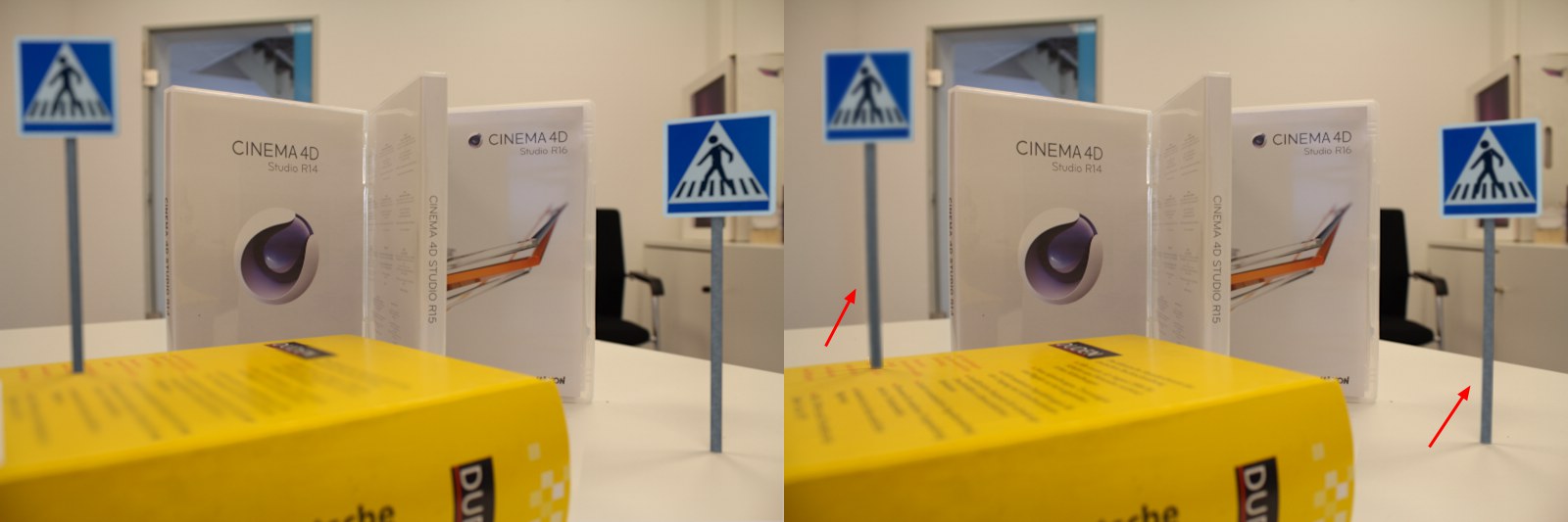 En la imagen de arriba dos señales de tráfico se colocaron delante de un fondo con una distorsión evidente de lente. A la izquierda renderizado sin compensar por el perfil de lente, a la derecha con perfil.