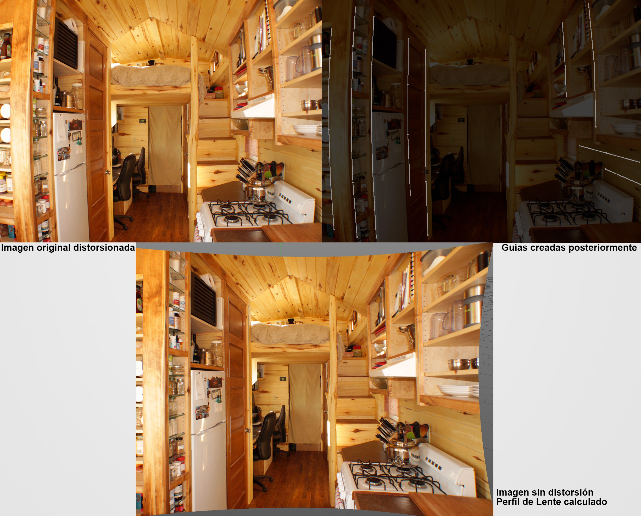 En la imagen de arriba se puede ver donde las guías se pueden colocar. En términos generales, cuantas más guías (precisas) se utilicen, mejor. Sería ideal si las guías pudieran colocarse en toda la imagen. Sin embargo, una sola guía que se coloque completamente equivocada (por ejemplo, una que se encuentre sobre un borde que es, de hecho curvado) puede conducir a un resultado inutilizable. Varias guías paralelas que se encuentran muy juntas en una región no son tan eficaces si otras áreas de la imagen no tienen guías en absoluto. La distorsión de la lente se puede calcular con mucha precisión en lugares en los que hay muchas guías, pero otras regiones sin guías puede calcularse de forma incorrecta. Es por esto que realmente ayuda a incluir una guía de cámara específica para la calibración de lentes!