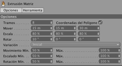 La herramienta Extrusión Matriz es similar a Extruir pero con una diferencia: puedes hacer tantos pasos de extrusión como quieras de una vez. Esto se consigue definiendo un valor relativo para el movimiento, rotación y tamaño, el cual se irá aplicando en cada paso.