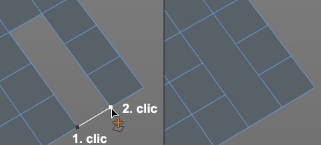 Clica en una arista o un punto, suelta el botón del ratón, clica en otro elemento: crea una línea de corte. No funciona en el modo de Uso de Polígonos.