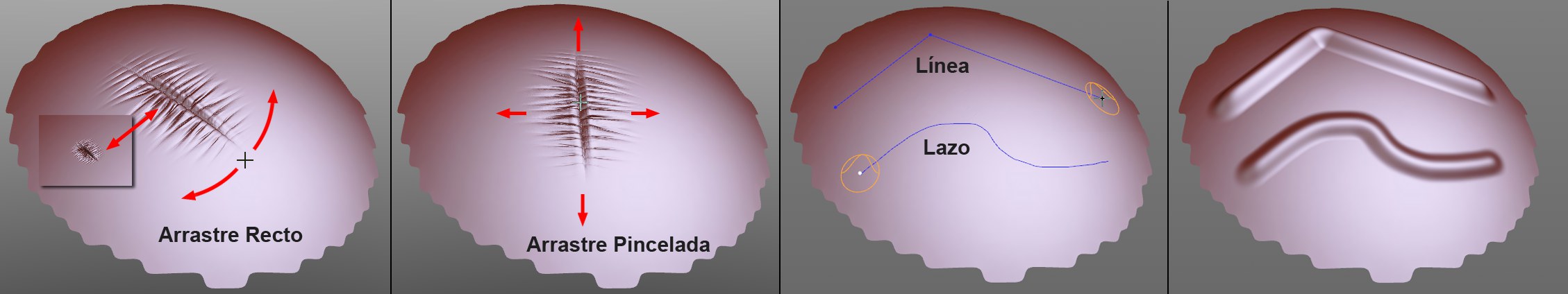 Los siguientes modos funcionan básicamente como sigue: se define una forma (no es necesario que esté situada completamente sobre el objeto al que se desea dar forma) sin usar pinceles, y en un segundo paso se traza la forma usando un pincel (mirar imagen arriba a la derecha). Pueden usarse los siguentes modos de operación: