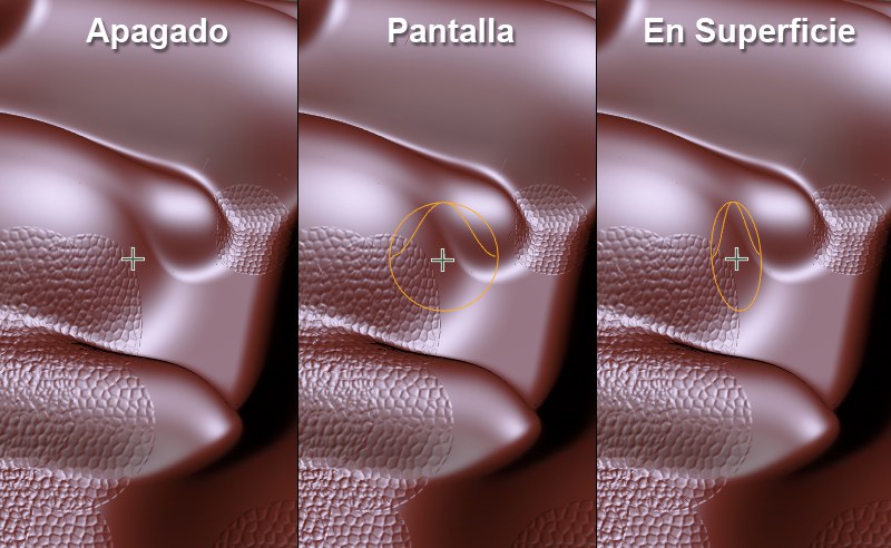 - En Superficie: el previo se mostrará en dirección al promedio de las normales (con respecto a las normales situadas bajo el diámetro del pincel). Esto facilita ver la dirección en la que el pincel esculpirá (en la mayoría de los casos se aplica al promedio de las normales).