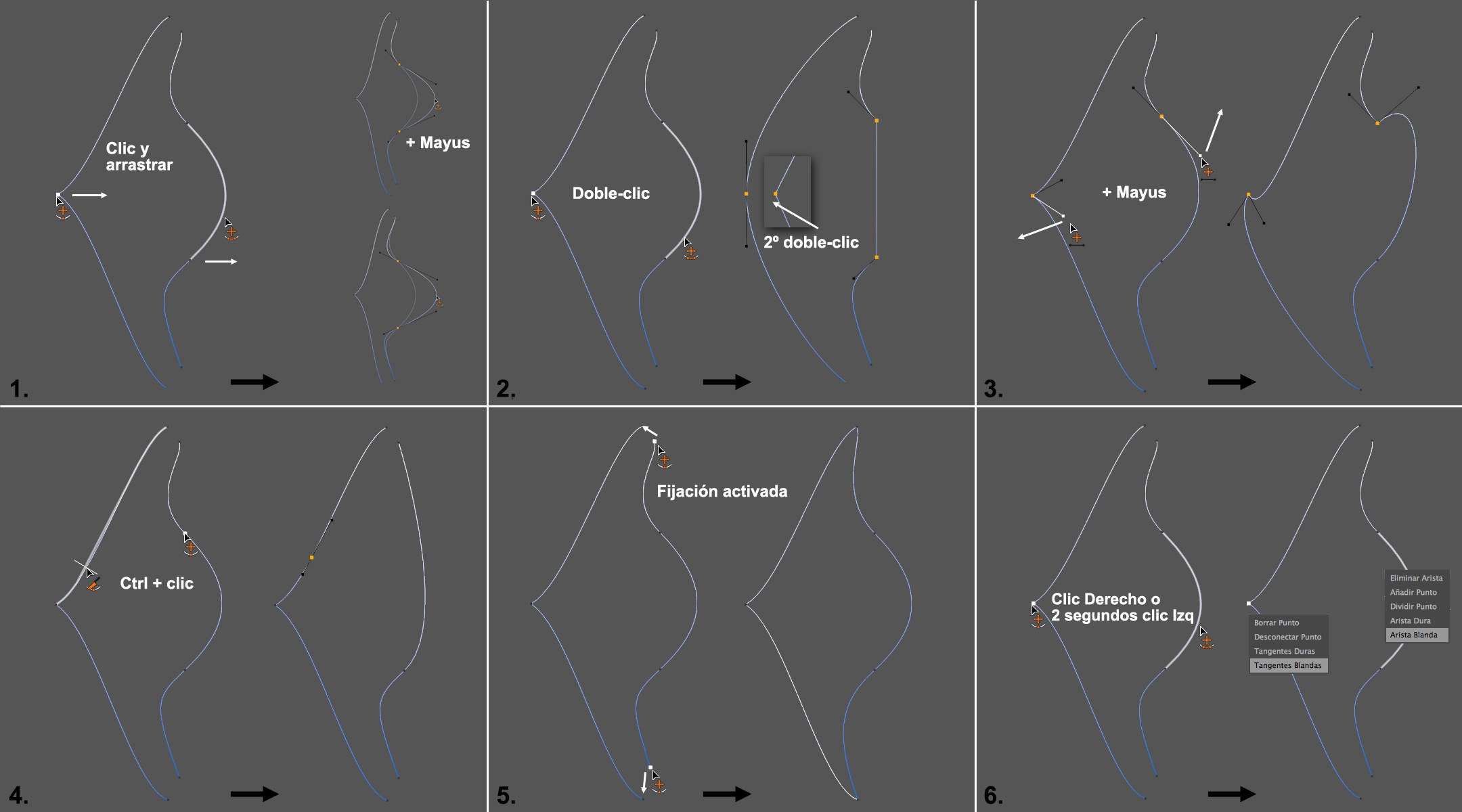 Lo mismo sucede cuando un punto con una tangente sin romper se hace doble clic por primera vez: esto cambiará entre tangente suave y tangente nula. Haciendo doble clic en las secciones de la spline cambia entre interpolación líneal y tangentes suaves (si la sección tiene un punto final, se requieren 2 doble-clics para el estado lineal). Este es un método rápido para respetar tangentes Este es un método rápido para restablecer tangentes defectuosos. -