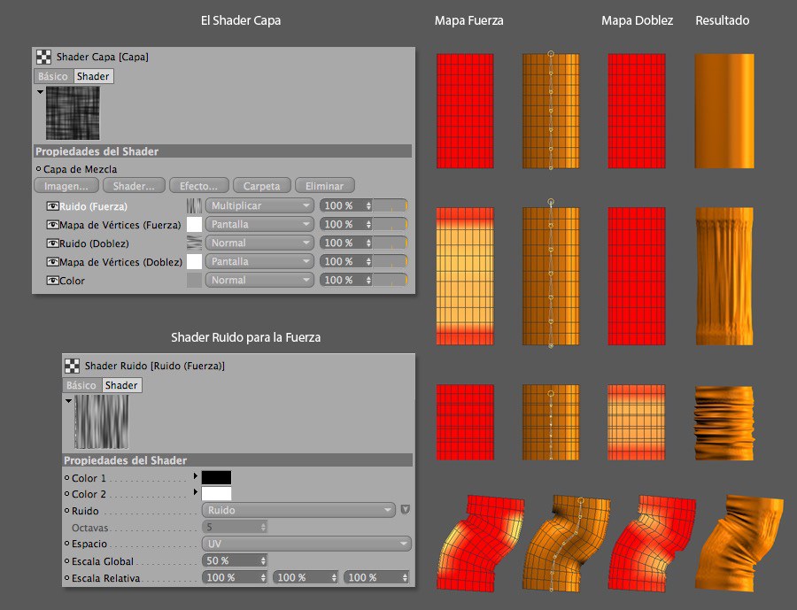 Entonces puedes usar esta información para varios propósitos. Uno de los usos principales es crear una apariencia natural a las dobleces y estiramientos cuando la malla se deforma. Esto se consigue cargando los mapas de vértices generados en los shaders mapas de vértices, los cuales son usados entonces como capas de máscaras dentro de un shader capa. Las máscaras en las capas se usan para mezclar variós mapas de estiramiento y de doblado en las áreas donde el estiramiento o la compresión se están dando.