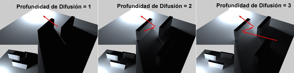 Aumentando el valor de Profundidad de Difusión se aumentará el realismo. Observa como la luz no llega a los muros con una Profundidad de Difusión de 1 ( = desactivar el Método Secundario).