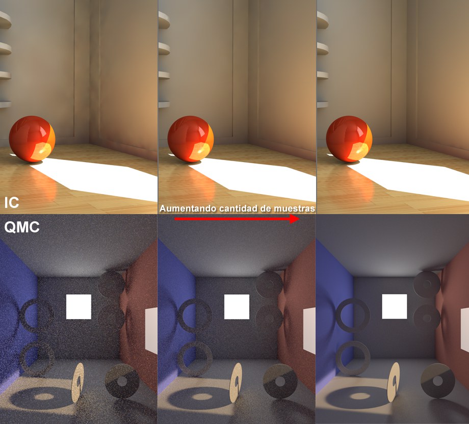Ten también presentes los Ejemplos renderizados, renderizados con varias combinaciones de ambos métodos (QMC+LM, por ejemplo, significa que se ha empleado QMC como Método Primario y Mapeado de Luz como Método Secundario).