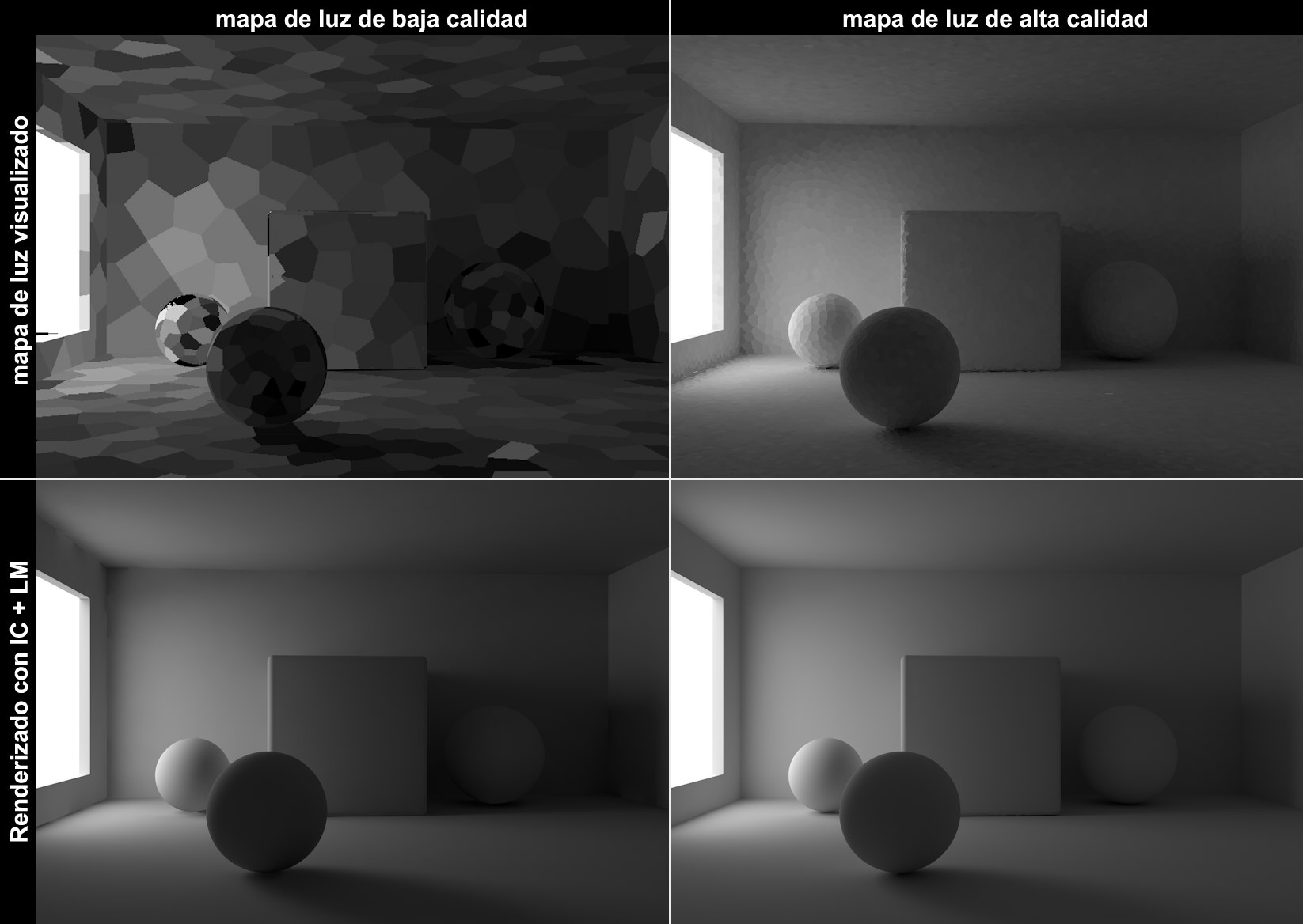 En la parte superior izquierda se muestra un Mapa de Luz pobre y en la parte superior derecha se muestra otro de mejor calidad. Los Mapas de Luz buenos tienen una progresión de la luz homogénea; en contraste, los Mapas de Luz de baja calidad tienen un aspecto no homogéneo. Al renderizar la diferencia no es tan visible porque el Método Primario muestrea el Mapa de Luz con numerosas muestras produciendo valores medios. Sin embargo, el Método Primario no producirá resultados óptimos, aunque se usen los mejores ajustes, si el Mapa de Luz calculado inicialmente es de baja calidad. Esto puede observarse en la imagen de la parte inferior izquierda, donde pueden apreciarse artefactos en la zona de la ventana y bajo la bola de la izquierda.