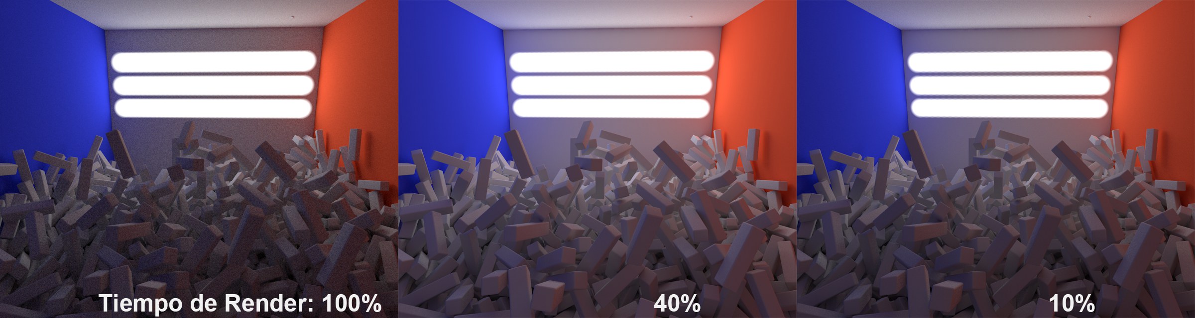 La siguiente imagen se ha renderizado usando QMC+QMC (Densidad de Registro de 8) en la parte izquierda, QMC+LM (Luces Directas desactivado) en el centro, y QMC+LM (Luces Directas activado) en la parte derecha: