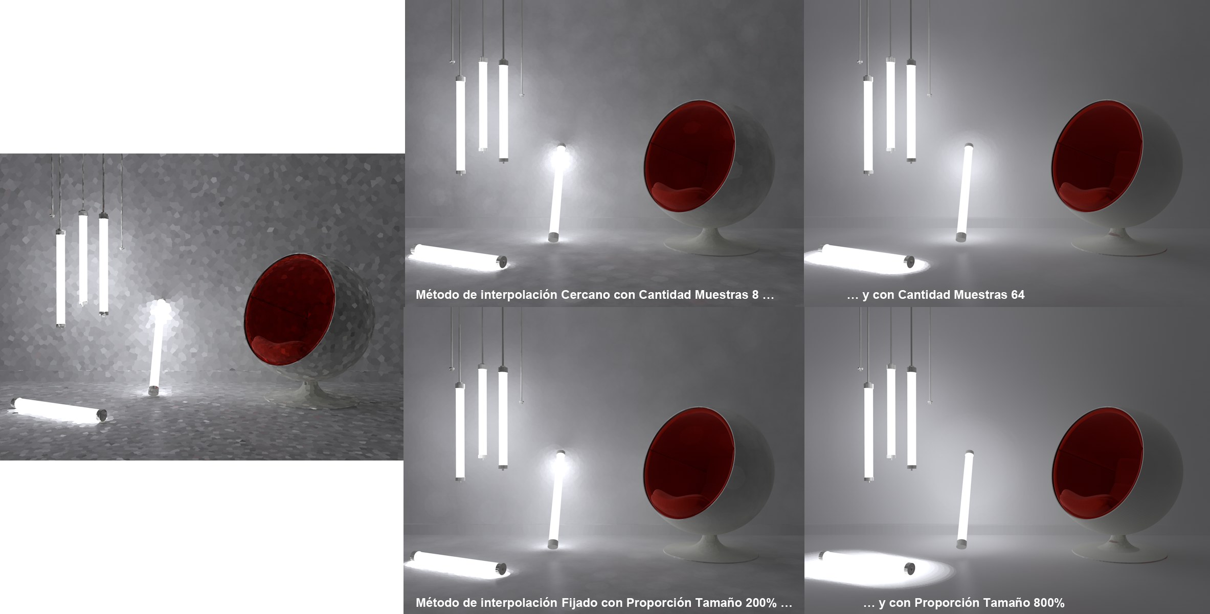 Pueden obtenerse resultados aún mejores en combinación con el Prefiltro. Sin embargo, la interpolación necesita tiempo de render adicional, además de que se producirán más fugas de luz en las interpolaciones grandes.