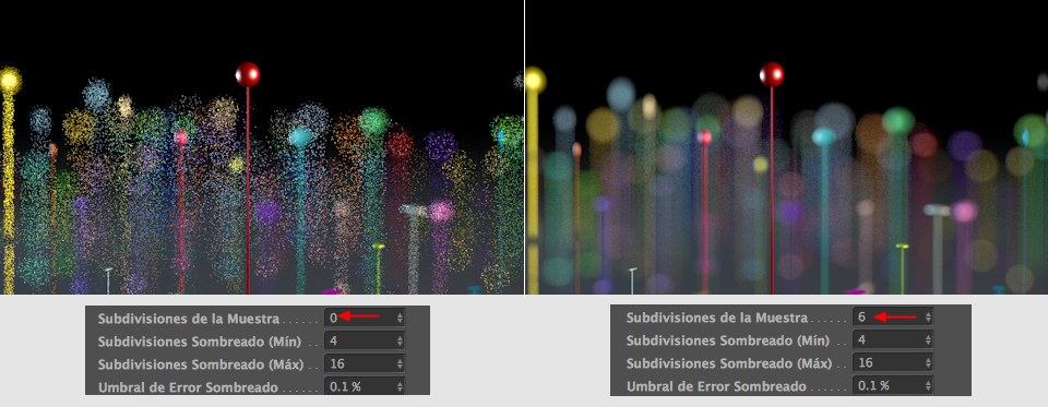 Los resultados de render usando los valores mostrados para Subdivisiones de Muestreo.