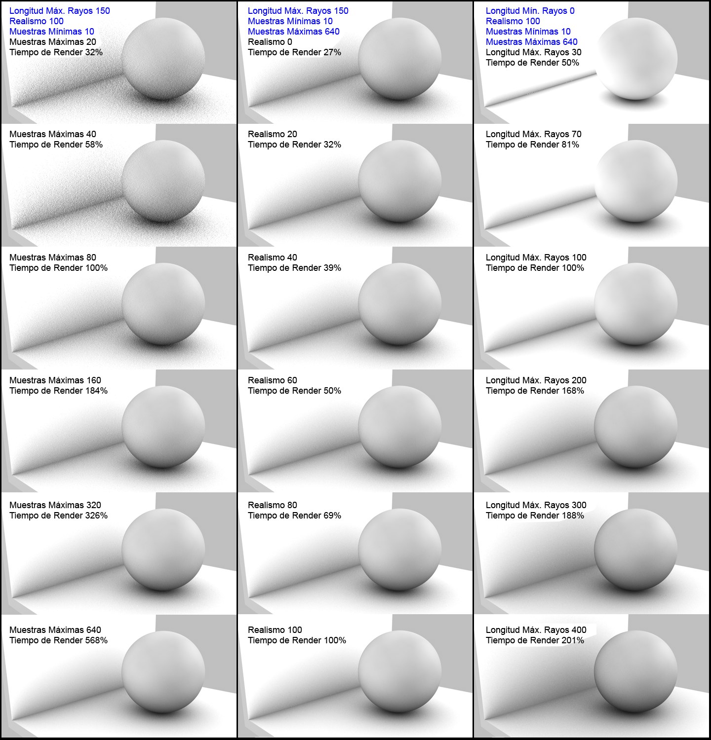 El tiempo relativo de render (por columna) está anotado en cada imagen para ofrecerte una impresión de cómo afecta el tiempo de render con los cambios en estos parámetros.