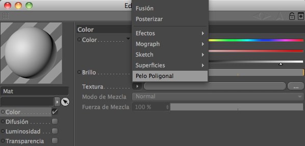 Si quieres renderizar pelo poligonal (mira la pestaña Generar), Cinema 4D te ofrece el shader Pelo Poligonal, el cual se puede cargar en el canal Luminosidad de los materiales normales de Cinema 4D.