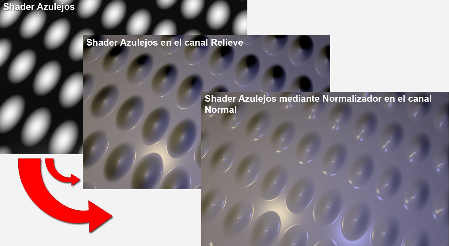 Usando el shader Normalizador (colocado en el canal Normal) pueden usarse en el canal Normal texturas comunes que normalmente se usarían en el canal Relieve. El Normalizador evalúa el contraste para obtener la ubicación de las aristas y usa esa información para calcular un mapa Normal. Como recordatorio: los mapas Normales y de Relieve funcionan básicamente del mismo modo. La infomación codificada en las imágenes RGB afectan a las Normales de superficie (geometría) de un objeto al renderizarlo, simulándose una estructura detallada. Al contrario que los mapas de Relieve, los mapas Normales también pueden ‘alterar’ la dirección de las Normales, haciendo posible la creación de efectos realistas (observa la luz especular en los bultos de la imagen anterior).