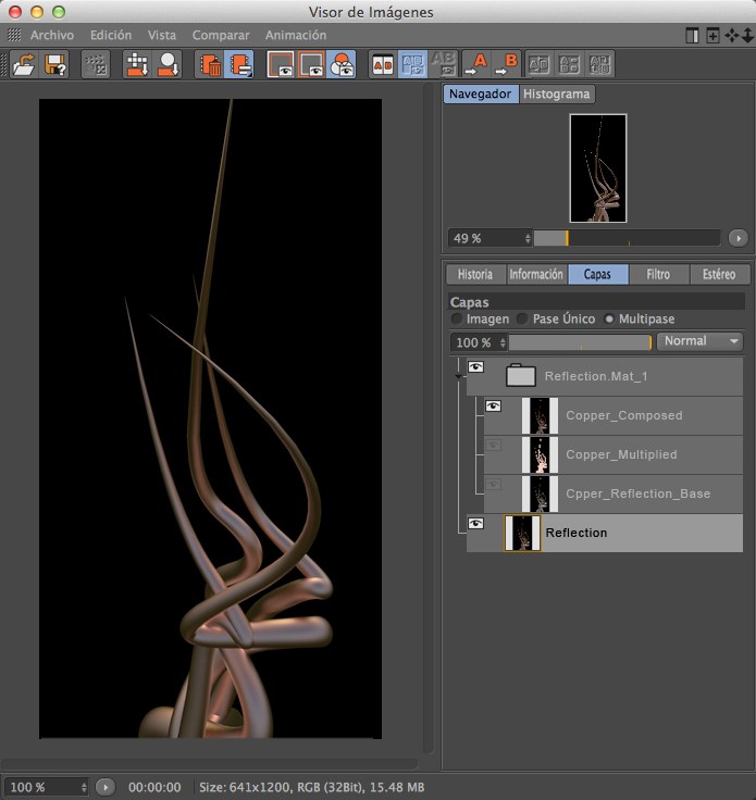 Además de la capa Reflexión (todas las reflexiones combinadas) también hay 3 capas en la carpeta Reflection_Mat_1. Si se hace esta capa visible cliqueando en el icono del ojo se hará visible la capa Copper_combined - y solo esta capa - se hará visible. ¿Por qué? Debido a que esta capa se compone de las capas Copper_Multiply y Copper_Reflection_Base. Si las dos capas restantes de esta carpeta se hubiesen hecho visibles entonces efectivamente tendrías dos reflexiones activas.