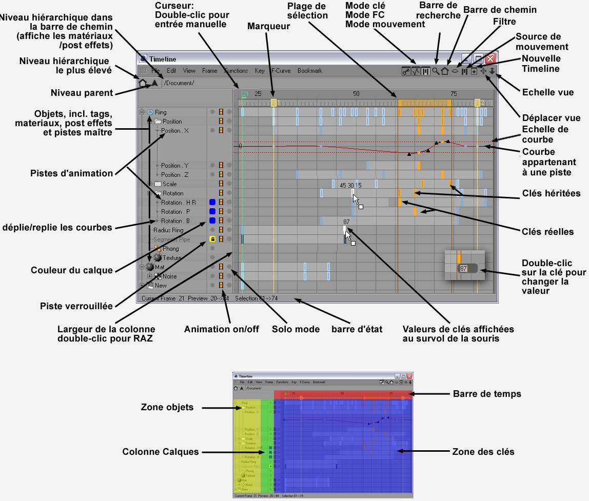 L'étendue de l'animation de chaque objet de scène est affichée dans une fenêtre horizontale. L'élément principal de toute animation est l’image clé (Clé). Les clés contiennent des informations (de déplacement par exemple) relatives à l'objet à un temps précis dans l'animation. La plupart des animations nécessitent le réglage d'au moins deux clés. Les changements de valeur d'une propriété d'objet sont interpolés entre ces deux clés (entre une valeur de rotation de 0° pour la clé 1, et de 90° pour la clé 50, par exemple). Le déplacement est visible lors de la lecture de l'animation.