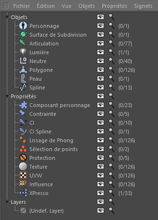 Le dernier type de filtre est le filtre de Calques, qui contient une liste de tous les calques utilisés dans la scène. Les calques inutilisés ne sont pas affichés. Dans la liste de calques se trouve également le calque Calque indéfini. Il ne s’agit pas d’un calque au sens propre. Il contient tous les éléments non explicitement affectés à un calque.