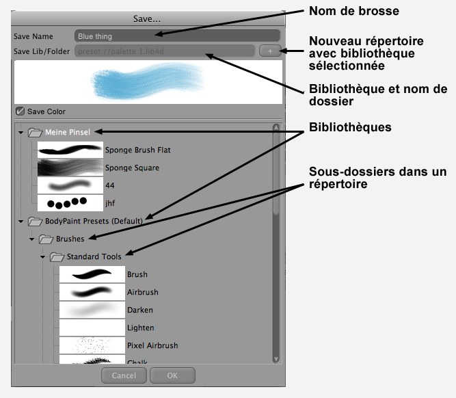 Cette commande ouvre une boîte de dialogue permettant de localiser votre ancien répertoire BodyPaint 3D, d'ouvrir le dossier prefs et de charger le fichier bodypaint_brushes.b3d. Les préréglages sont ensuite convertis en bibliothèque et chargés dans la nouvelle médiathèque. Cette bibliothèque se trouve à son emplacement par défaut dans le dossier CINEMA 4D / BodyPaint 3D (library / browser / bodypaintuser.lib4d).