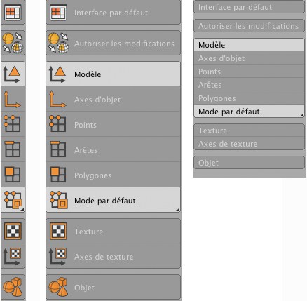 Si cette commande du menu contextuel n’est pas activée, la commande visible d’un groupe d’icônes sera toujours la dernière commande sélectionnée. Par exemple, si la commande visible est Cube et que vous sélectionnez la commande Cône dans le groupe de commandes, afin d’insérer un cône dans la scène, la commande Cône deviendra la commande visible. Si cette commande est activée, l’icône visible sera verrouillée, ce qui veut dire que, quel que soit l’outil sélectionné dans le groupe d’icône, la commande visible restera la même.