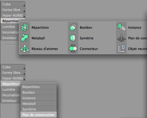 Si vous n’avez pas sélectionné la commande Verrouiller l’icône visible dans le menu contextuel, l’icône visible sera toujours celui de la dernière commande sélectionnée dans le groupe. Par exemple, si la commande visible est Cube et si vous sélectionnez la commande Cône dans le groupe de commandes afin d’insérer un cône dans la scène, la commande Cône deviendra la commande visible. Dans un groupe de commandes les commandes sont placées dans le même ordre que lorsqu’elles étaient côte à côte dans la palette de commandes. Vous devez donc choisir l’ordre des commandes avant de les placer dans un groupe.