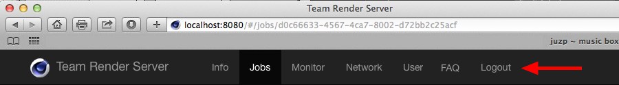 En haut à droite de l’interface navigateur (ou en bas de l’interface telle qu’elle s’affiche sur un appareil mobile) se trouve le bouton de déconnexion du serveur Team Render. Une fois que vous vous êtes déconnecté, le serveur Team Render continue de fonctionner et tous les travaux de rendu démarrés seront exécutés dans l’ordre dans lequel ils ont été définis.