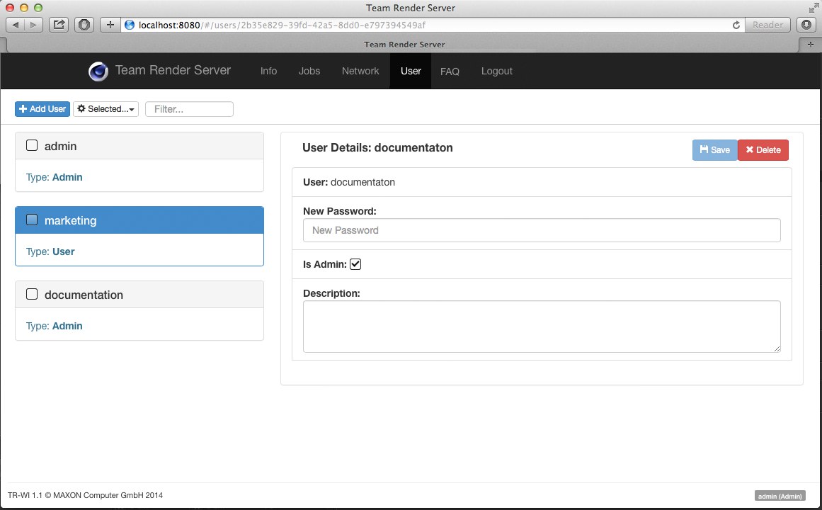 Une fois l'utilisateur ajouté, il/elle pourra se connecter au serveur Team Render grâce aux informations fournies (adresse navigateur : voir Interface du navigateur) et pourra réaliser des rendus.