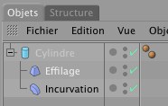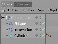 Tous les déformateurs sont activés automatiquement lors de leur création. Lorsqu’un déformateur est activé, l’icône d’encoche est visible dans le gestionnaire d’objets.