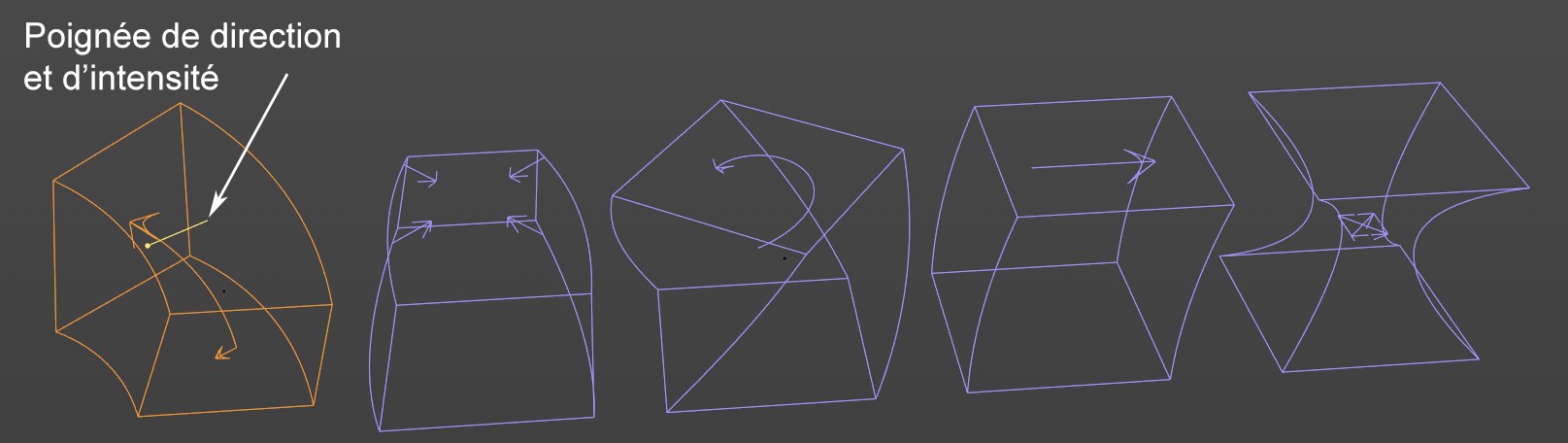 Les déformateurs courbure, écrasement et étirement, torsion, dilatation/contraction et cisaillement affichent dans leur aperçu la direction dans laquelle ils opèrent.