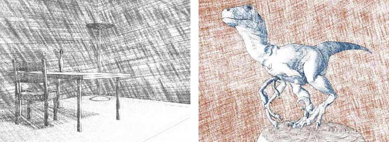 Cette pièce et ce dinosaure ont l'air d'avoir été dessinés à la main. La clé pour créer ce style se trouve dans la variation d'épaisseur de la ligne et dans le style de ligne. Sketch and Toon permet de (re)créer presque tous les styles.