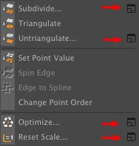 Plusieurs commandes (principalement situées dans le menu Maillage) possèdent de nombreuses options. Les afficher toutes en même temps à chaque fois que vous sélectionnez une commande n'est pas très pratique. C'est pour cela que l'icône mise en surveillance dans l'image du dessus est disponible. Lorsque vous cliquez dessus, les options de la commande s'affichent et peuvent être mises au point. Ces paramètres s'appliqueront alors à chaque fois que vous utiliserez cette commande (seulement via raccourcis).