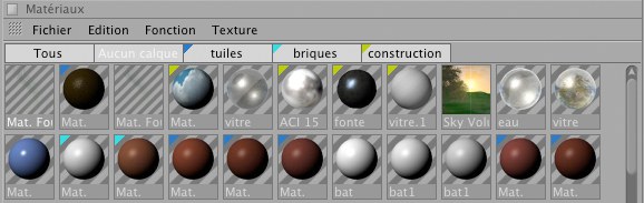 Cette commande ouvre le Gestionnaire de matériaux s’il était fermé, ou l’affiche au premier plan s’il était masqué. Le Gestionnaire de matériaux héberge tous les matériaux utilisés dans une scène avec leurs vignettes de prévisualisation. Vous pouvez assigner un matériau à un objet par glisser-déposer. Sélectionnez le matériau et déposez le sur l’objet approprié dans le Gestionnaire d’objets ou dans la Vue.