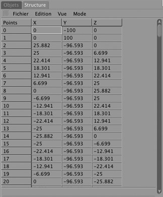 Cette commande ouvre le Gestionnaire de structure s’il était fermé, ou l’affiche au premier plan s’il était masqué. Le Gestionnaire de structure permet de visualiser et de modifier les données numériques des Points, Polygones, Coordonnées UVW et Cartes d’influence de chaque objet.