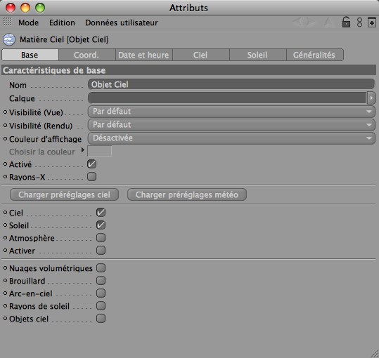 Vous pouvez également ouvrir le gestionnaire de ciel en double-cliquant sur l’objet Ciel. Les paramètres du gestionnaire de ciel sont également accessibles par le gestionnaire d’attributs. Pour les explications qui vont suivre, nous utiliserons le gestionnaire de ciel.