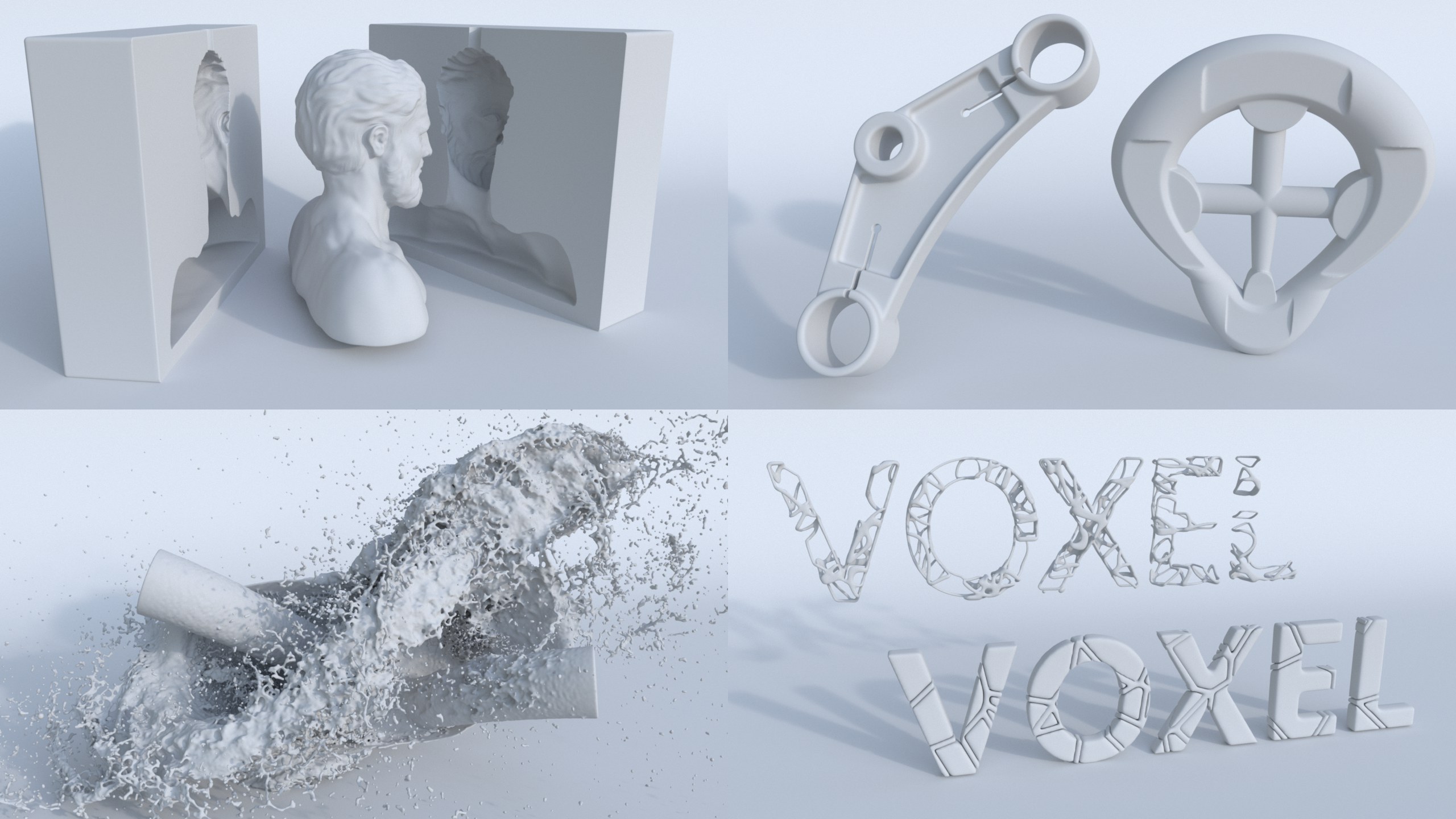 Différentes utilisations d’OpenVDB. Dans le sens des aiguilles d’une montre en commençant par le haut à gauche : implémenté deux fois avec des fonctions booléennes (la croix est formée d’élements primitifs simples affectés par un Déformateur), texte avec un Filtre de reformation et enfin avec un fluide.
