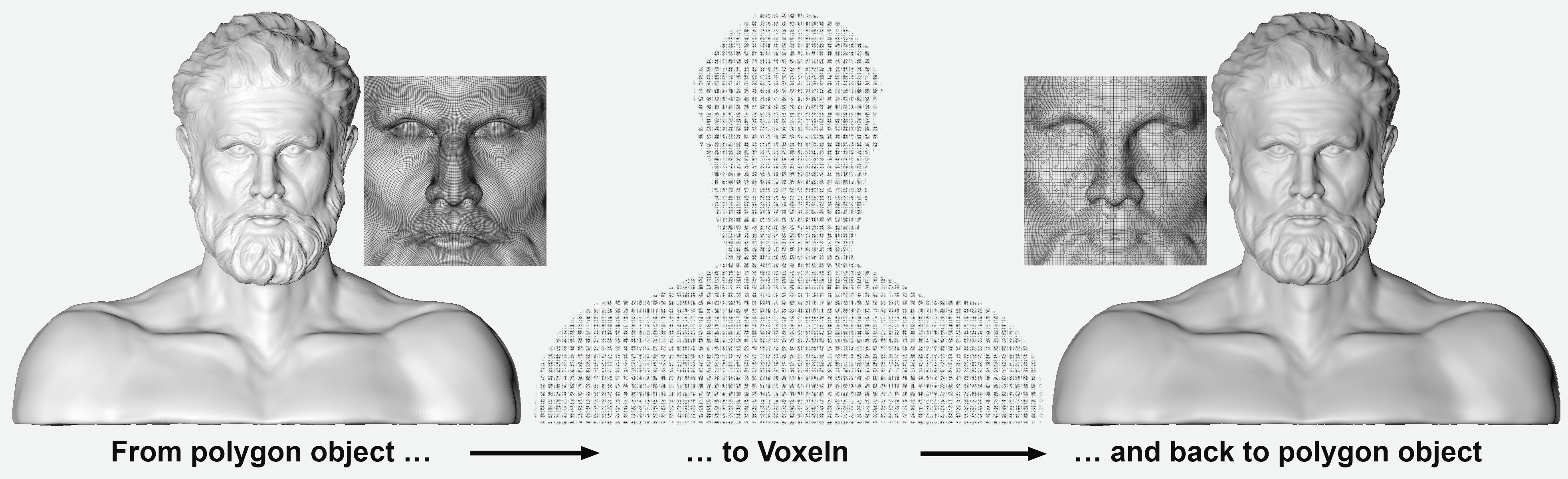 Certaines tâches (par ex. des opérations booléennes) peuvent être exécutées plus efficacement qu’avec des objets polygonaux à l’aide des Voxels. C’est pourquoi une conversion d’opère doucement dans les deux sens.