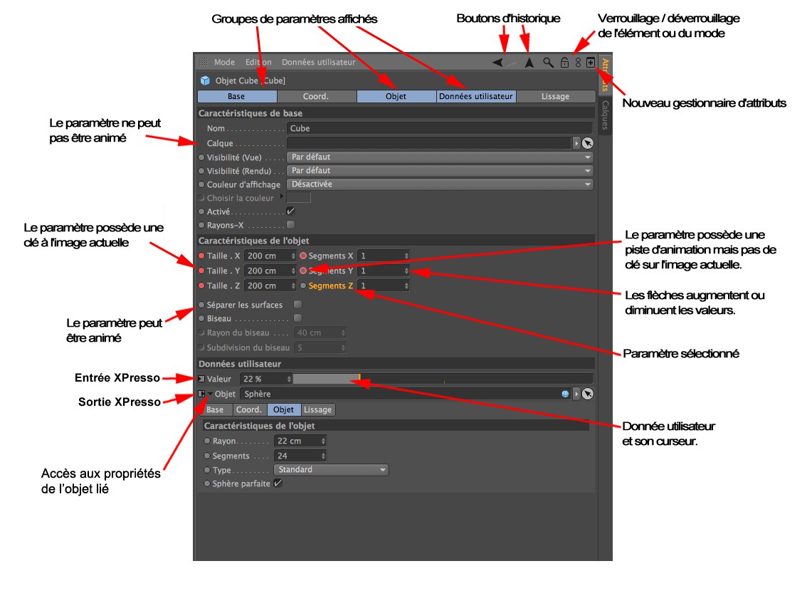 Toute modification effectuée dans le gestionnaire d’attributs est reportée en temps réel dans la fenêtre correspondante (vue, ligne temporelle, éditeur XPresso, etc.).