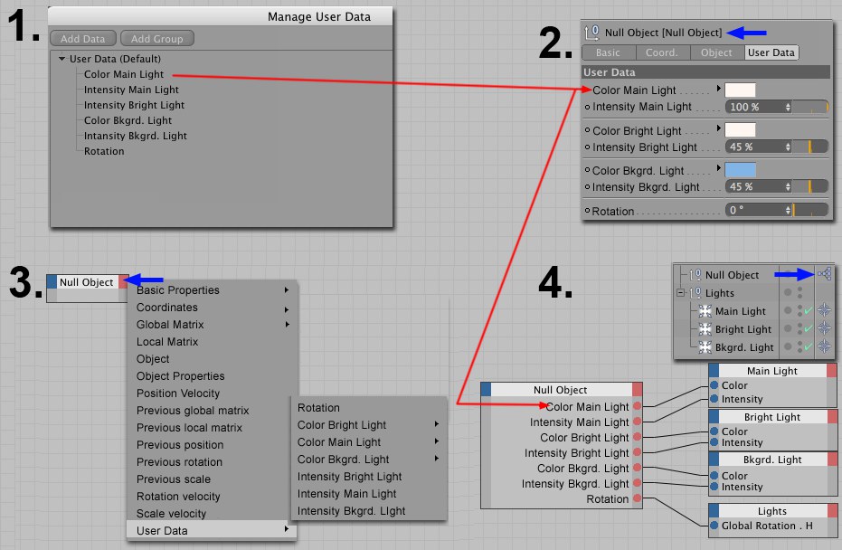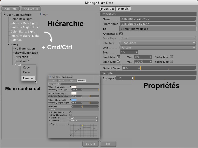 Souvent, des scènes complexes contiennent une grande quantité d’objets. Si de telles scènes sont confiées à d’autres utilisateurs pour modification (ex. création du rig d’un personnage qui a besoin d’être animé), il est utile de créer des données utilisateur qui vont affecter les objets via XPresso (ne paniquez pas, ces expressions sont très simples). Vous retrouverez la scène présentée avec les paramètres qui ont besoin d’être modifiés. Dans la plupart des cas, un objet neutre est créé et se voit assigné unepropriété XPresso dans laquelle les données utilisateur sont enregistrées. Cependant, les données utilisateur peuvent être assignées à un objet et affiché dans le gestionnaire d’attribus. Elles sont enregistrées avec la scène et peuvent être copiées d’une scène à l’autre.