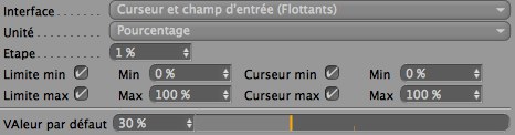 Limite Min / Max: Définit les limites entre lesquelles le paramètre peut être défini pour un élément. Les premières valeurs Min/Max définissent la plage couverte par les entrées numériques; la valeur du curseur définit uniquement le minimum et le maximum qui peuvent être atteint en déplaçant le curseur.