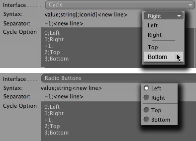 Bouton Radio, liste de sélection, bouton cycle, Radio Quicktab
