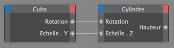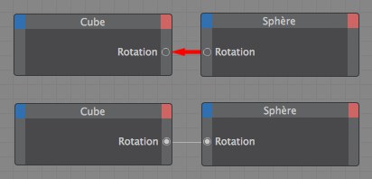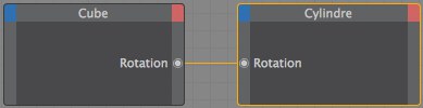 Les nœuds de connexion sont à la base de toute expression XPresso. Les nœuds peuvent réaliser des tâches diverses et variées, qu’il s’agisse de l'affichage du numéro de l'image active d'une animation ou du simple changement de position d’un objet. Pour construire une expression, vous devez créer les nœuds de connexion nécessaires et les connecter en traçant des traits (des câbles) entre leurs ports d’entrée et leurs ports de sortie. Les nœuds peuvent ensuite se transmettre des valeurs via ces ports et ces câbles.