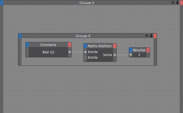 Les groupes X sont des conteneurs. Il est possible d’y placer des nœuds, d’autres groupes, et les câbles qui les relient. Les groupes X permettent de ranger des éléments apparentés dans la même boîte, afin de mieux les organiser. Ils simplifient la navigation dans les expressions et leurs modifications. De plus, il est possible de connecter un groupe X à des nœuds et à d’autres groupes X, d’enregistrer et charger des groupes X, et de les réutiliser pour d’autres projets.