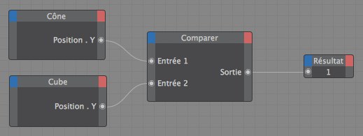Quatre nœuds de connexion. Le nœud de résultat affiche la valeur 1 si le cône et le tube sont de la même hauteur (valeur Y).