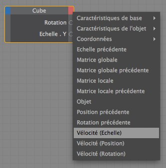 Les nœuds de connexion sont les principaux blocs de construction des expressions. Ils ont été conçus pour accomplir les tâches les plus diverses, de l’indication de la position active d’un objet aux calculs d’opérations mathématiques. Suivant le type de nœud, il est possible d’ajouter différents ports d’entrée et de sortie aux nœuds. Comme dans le cas des groupes X, vous pouvez ajouter ces ports en utilisant le menu d’entrées ou le menu de sorties (les carrés bleu et rouge de la barre de titre du nœud).
