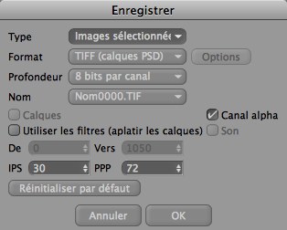 Si vous choisissez Animation dans le champ Type la séquence d’images à enregistrer peut être définir à l’aide de ces valeurs.